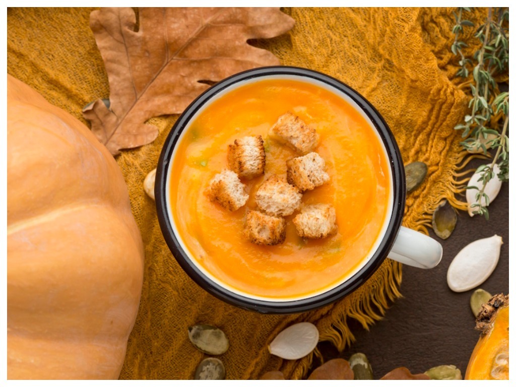 Мы не забыли и о вегетарианцах, а также участниках ретритов, йога- и травниковых практик. Для них мы готовим блюда, которые разнообразят вкус и подарят радость. Например, этот суп-пюре из тыквы с сухариками из домашнего бездрожжевого хлеба. Дорогим вегетарианцам придется отбиваться от мясоедов – он понравился всем!